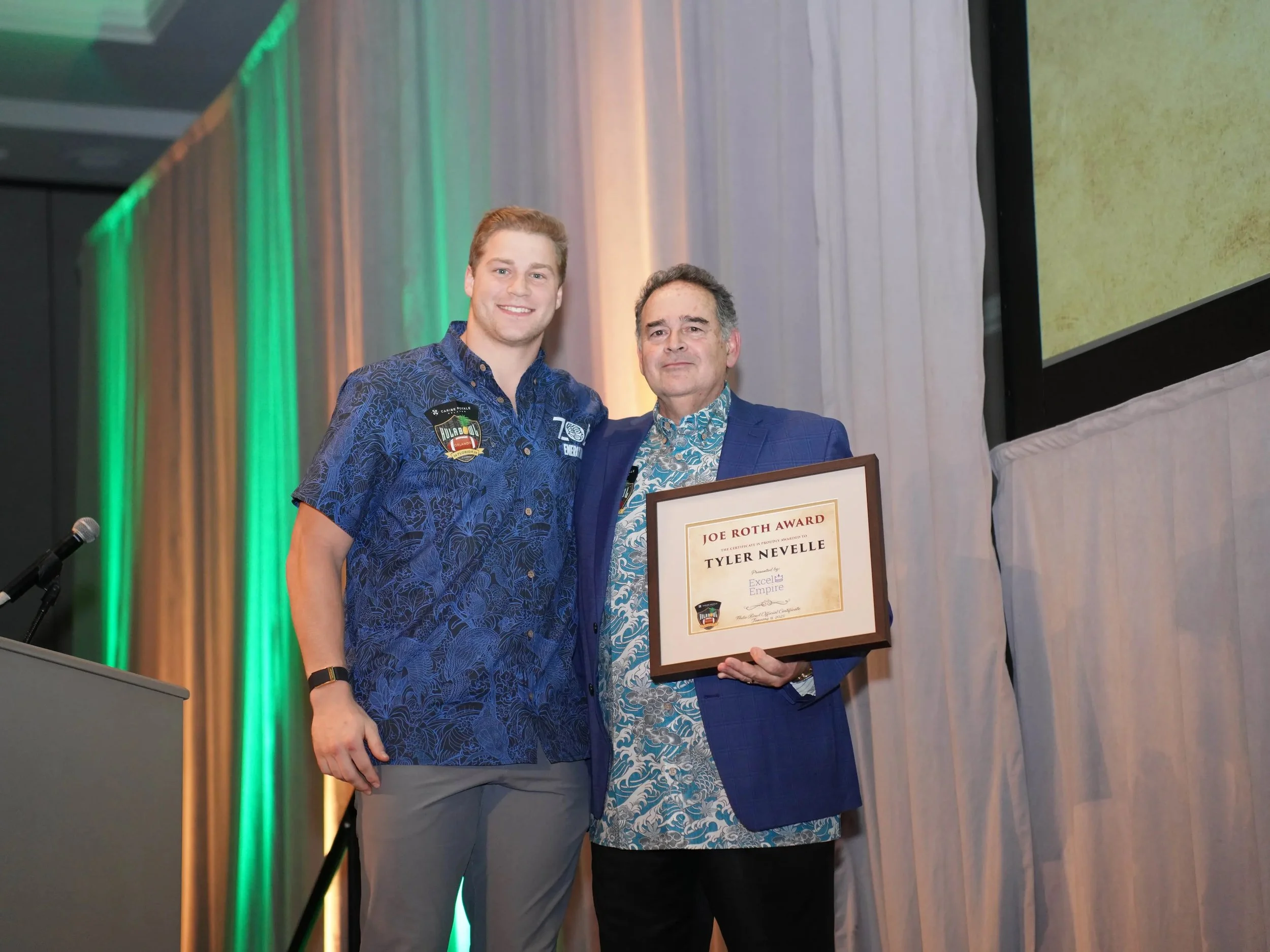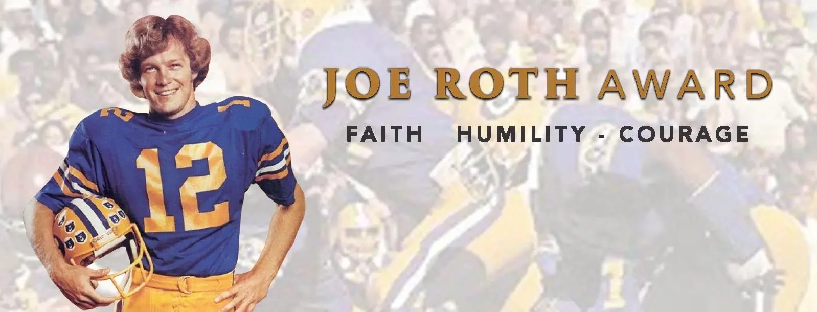 In 2020 the Hula Bowl introduced the inaugural Hula Bowl Joe Roth award. Joe Roth was an All-American QB at the University of California Berkeley. Roth played the 1976 season knowing he was dying of melanoma. Joe was a young man committed to his Faith, his family, and his team. He exemplified the call to put other first and lead through service. After a private fight with cancer, Joe died in February 1977, three months after his last regular season game and just weeks after playing in the Hula Bowl Football All-Star game in Hawaii. His jersey #12 is the only one ever retired by the California Golden Bears football program. The Joe Roth Award was established to honor Joe's legacy, and his passion for Faith, humility, and courage. Each year, the Hula Bowl selects an athlete from the current Hula Bowl roster to be recognized for their character both on and off the field.